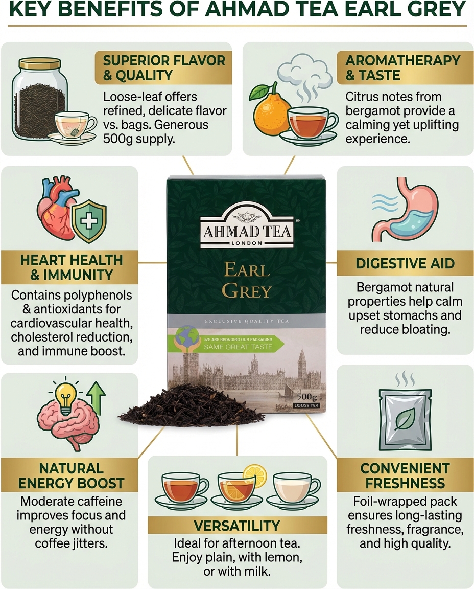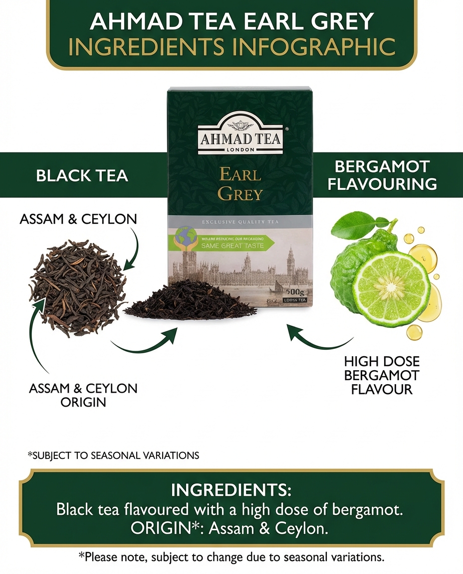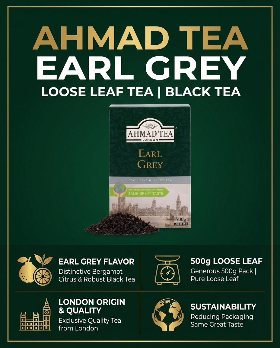 Ahmad Tea Earl Grey Loose Leaf Tea 500g. Ahmad Tea’s Earl Grey is a carefully crafted loose leaf blend that balances the malty depth of premium black tea with the bright, floral notes of natural bergamot. First blended in 1986, Ahmad Tea has built a reputation for consistent quality by sourcing directly from gardens in Kenya, India, and Sri Lanka. We specifically use larger leaves in this elegant blend, resulting in a more impactful and sophisticated flavour, perfect for the discerning tea-lover. This exceptional earl grey tea is expertly blended with high altitude teas from India and East Africa to bring that clean, crisp flavour of quality black tea. Accented with a touch of exotic citrusy bergamot, this blend becomes a truly memorable experience. Each pack is garden fresh sealed to best preserve the flavour and aroma, ready for whenever you want to enjoy it.